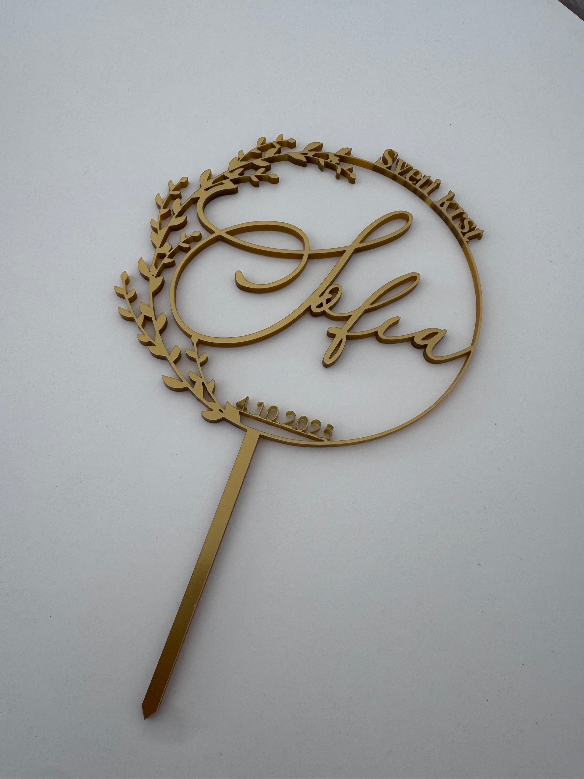 Dodajte poseben čar vašemu praznovanju s čudovitim cake topperjem, izdelanim iz kakovostnega zlatega akrila. Elegantna oblika z nežnimi detajli in personaliziranim imenom ter datumom je popolna dekoracija za: