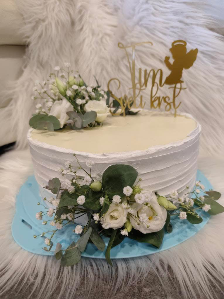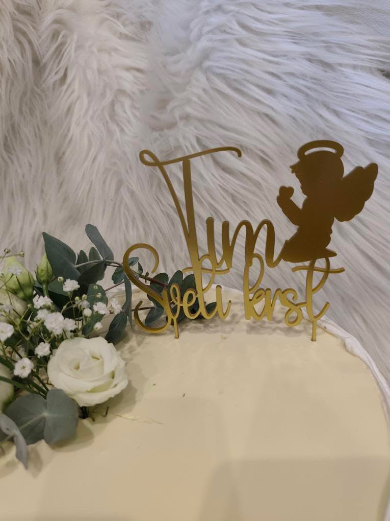 Čudovit personaliziran cake topper iz zlatega akrila je popolna dekoracija za torto ob svetem krstu. Topper vključuje ime otroka, nežno silhueto angelčka ter napis Sveti krst, vse v elegantnem zlatem sijaju, ki doda praznični torti poseben čar.