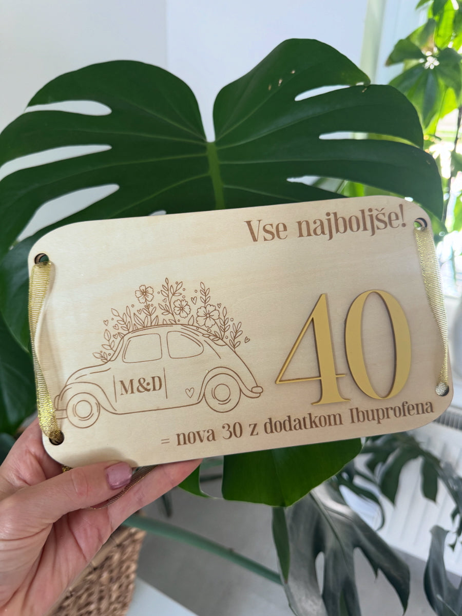 Presenetite slavljenca ali slavljenko z elegantno in trajno leseno čestitko, izdelano iz kakovostnega lesa in obogatene z natančno graviranim motivom. Osrednji poudarek čestitke so bleščeče zlate akrilne številke “40”, ki simbolizirajo pomemben mejnik in dodajo pridih prestiža.