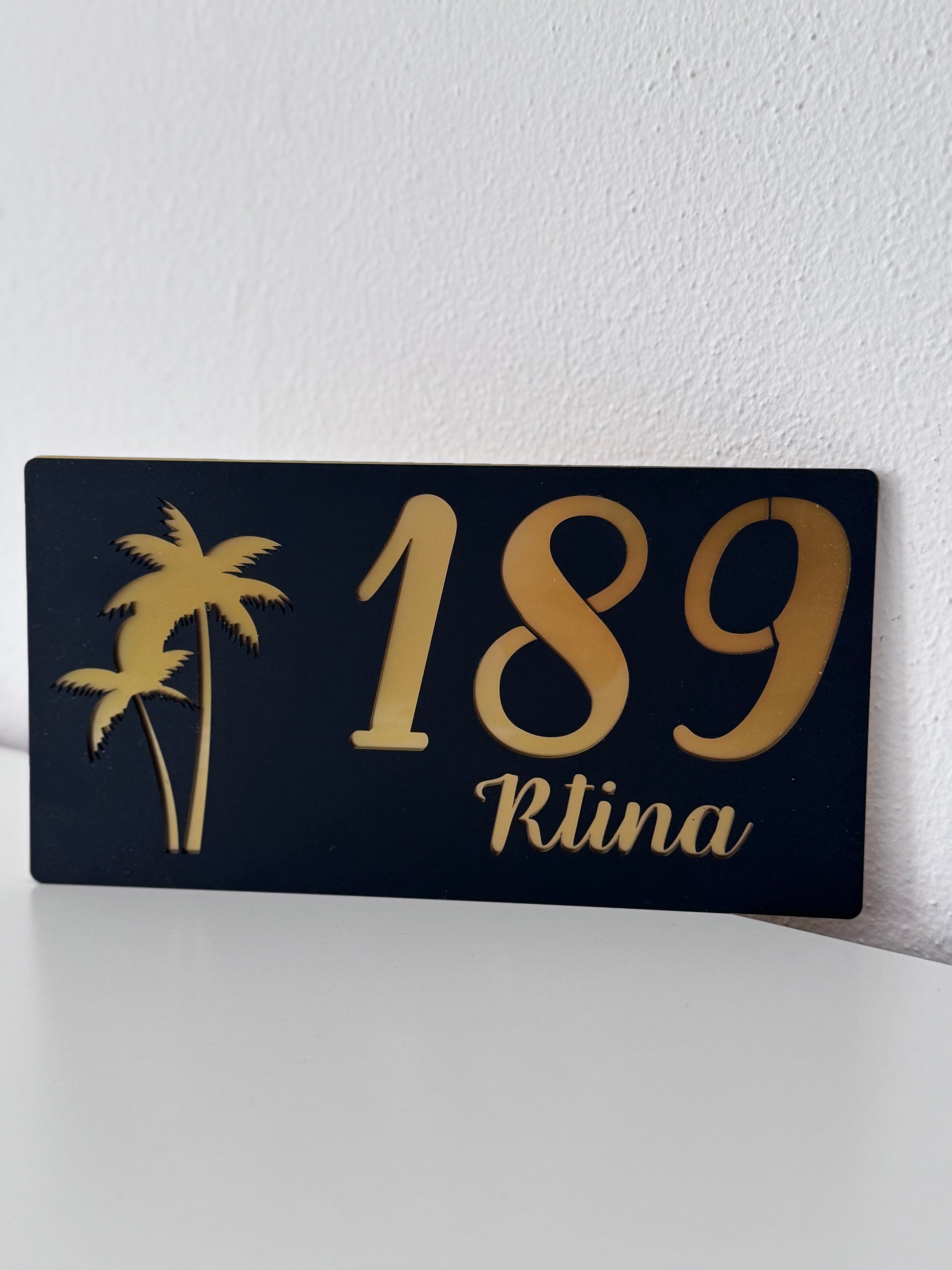 Motiv: številka, ime kraja in palmica – popolno za obmorske ali počitniške hiše