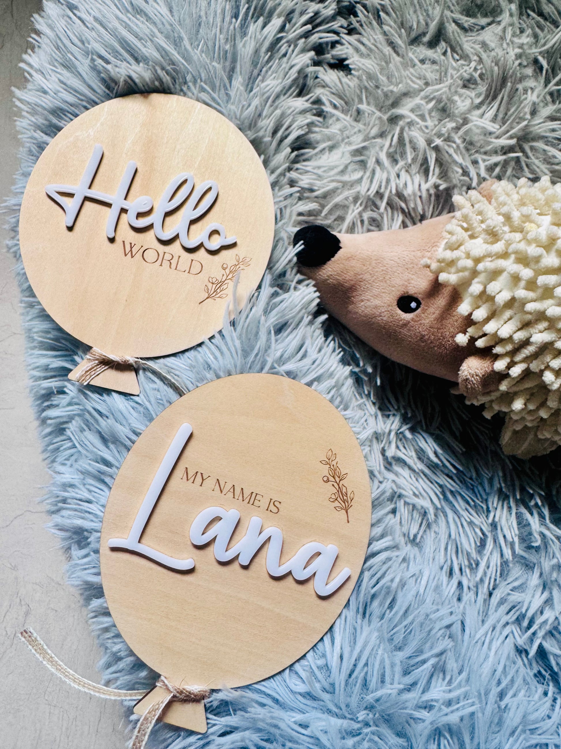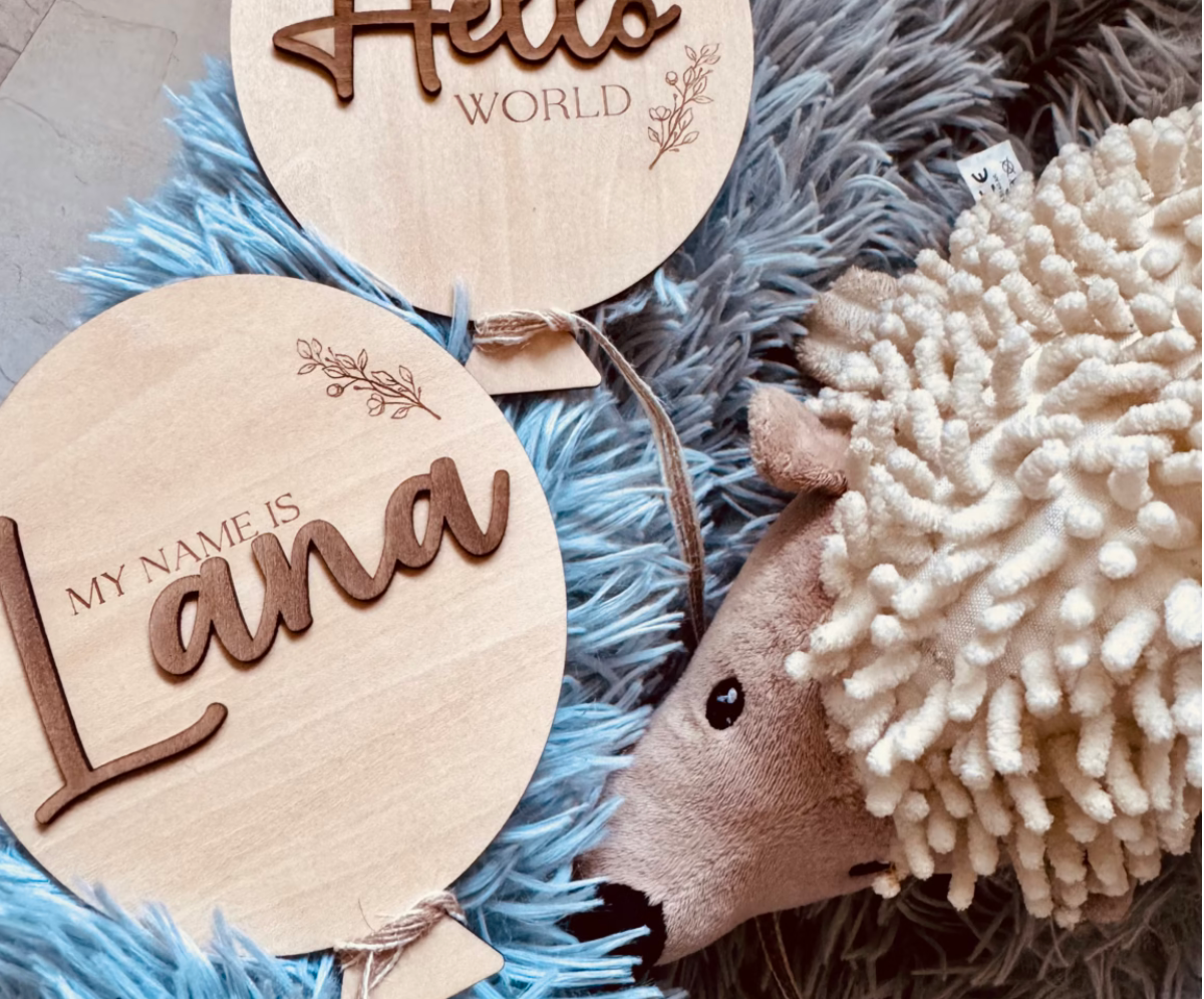 Z napisi “Hello World” in “My name is…” sta ustvarjena za prve fotografije, spominske škatle ali dekoracijo otroške sobice.