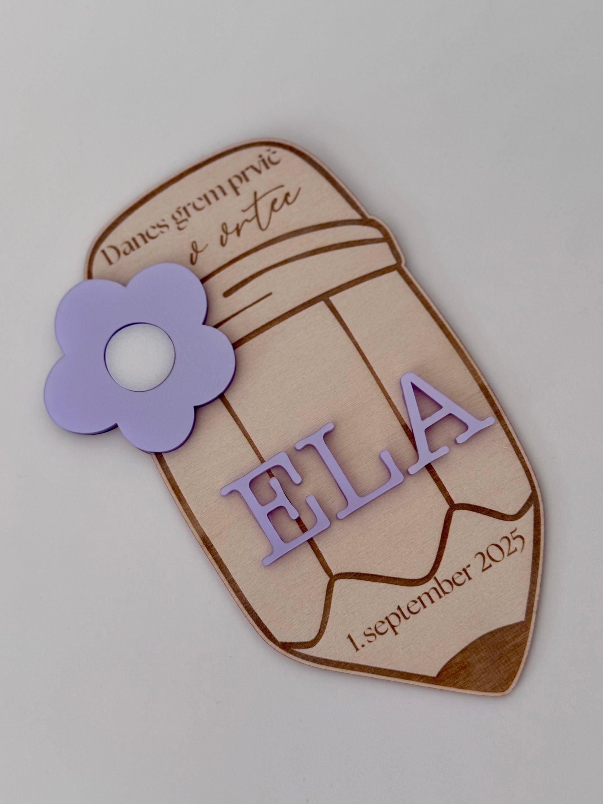 Ujemite poseben trenutek, ko vaš malček prvič stopi skozi vrata vrtca! Ta čudovita oznanitvena ploščica v obliki svinčnika je izdelana iz kakovostnega lesa, z dodanim napisom in ljubko rožico iz akrila, ki doda barvit in igriv pridih.