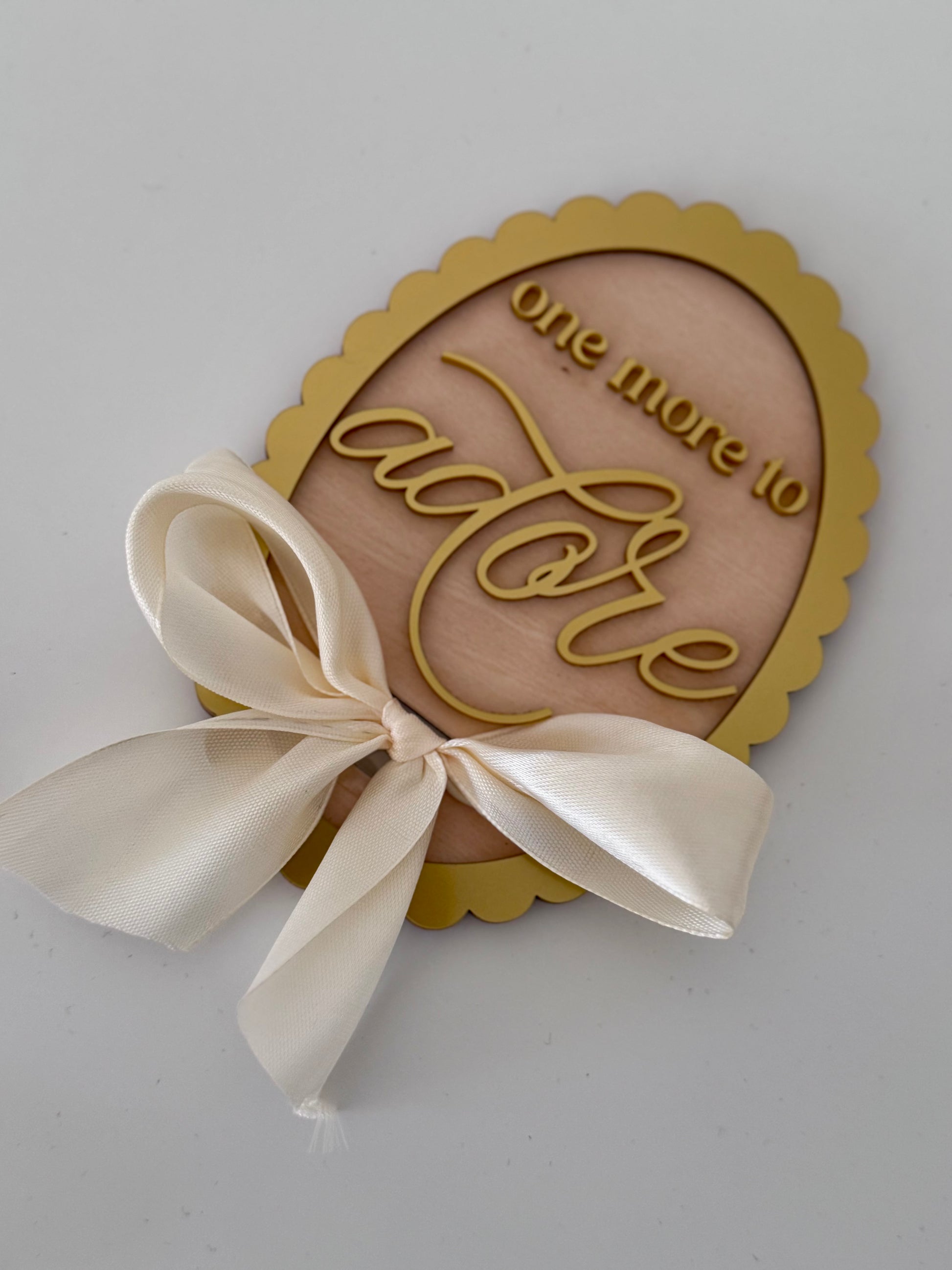 Nežna in elegantna ploščica, ustvarjena za čudovito oznanitev novega člana družine. Izdelana je iz kakovostnega lesa in zlatega akrila, ki ji daje prestižen sijaj ter toplino. Besedilo “one more to adore” je izrezano v prefinjeni pisavi, dopolnjeno s kremno satenasto pentljo, ki ploščici doda pridih nežnosti.
