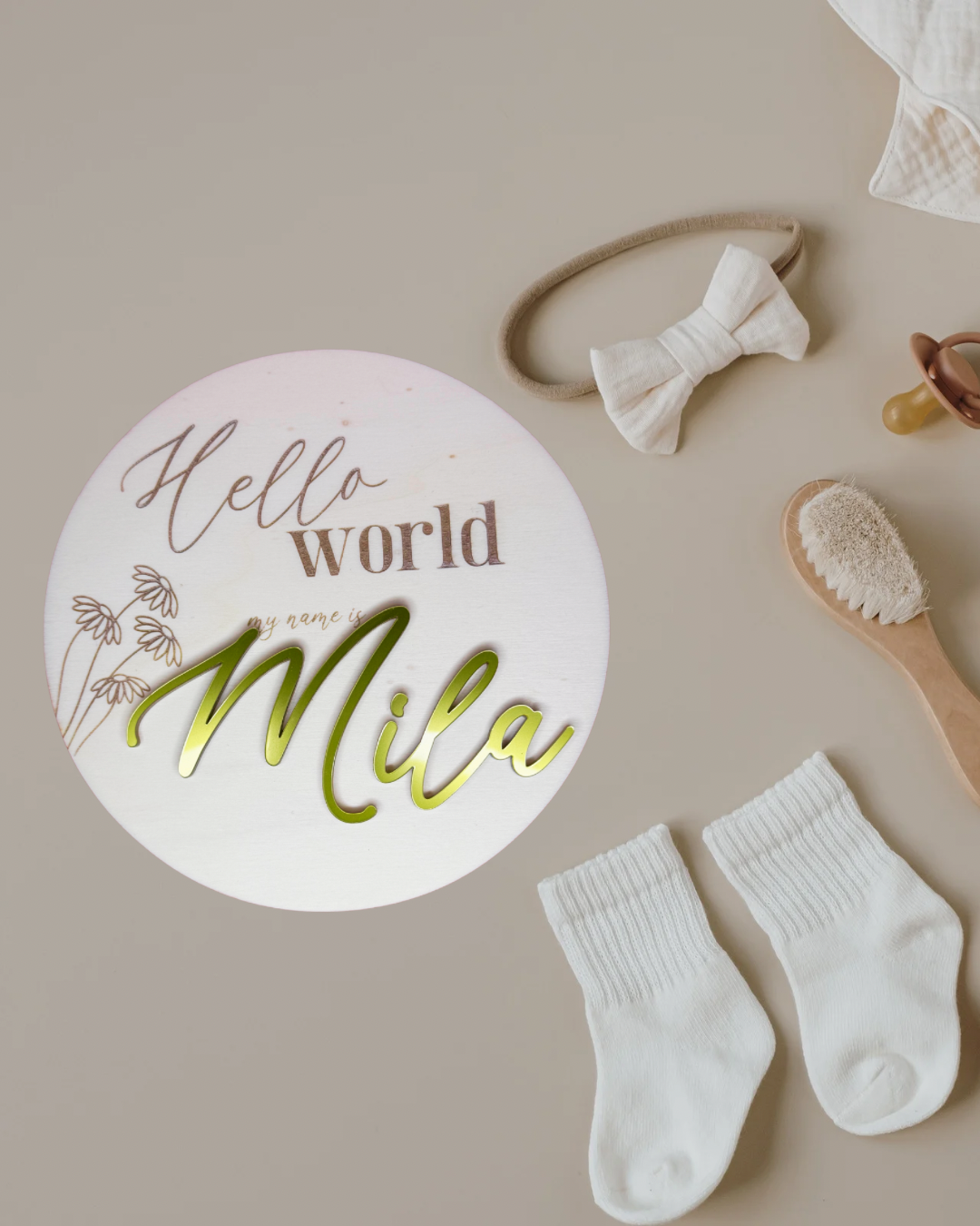 Pozdravite svet na edinstven način s tem ljubkim lesenim oznanilom “Hello World, My Name Is…” z imenom vašega malčka iz zlatega akrila! To personalizirano oznanilo bo popoln način, da predstavite novega družinskega člana.