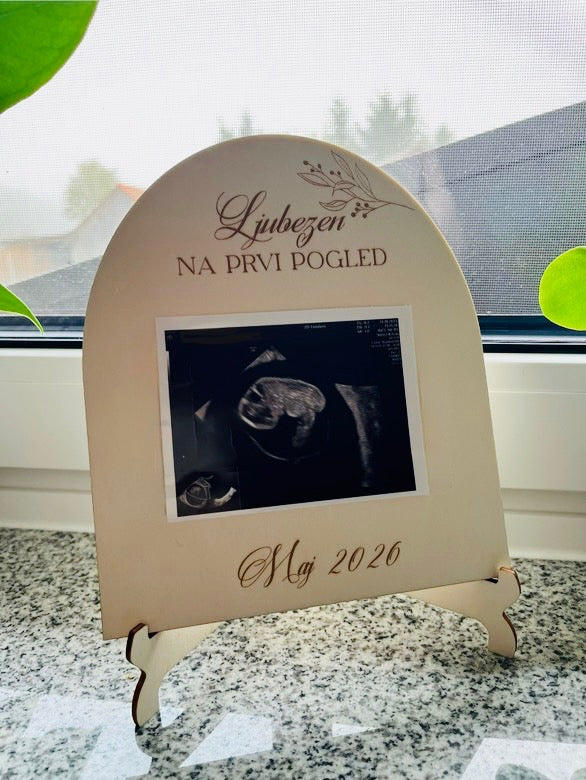 V sredini ima posebej oblikovan prostor za fotografijo ultrazvoka, ki čudovito dopolni graviran napis in naravni videz lesa. Zraven je tudi priložen podstavek.