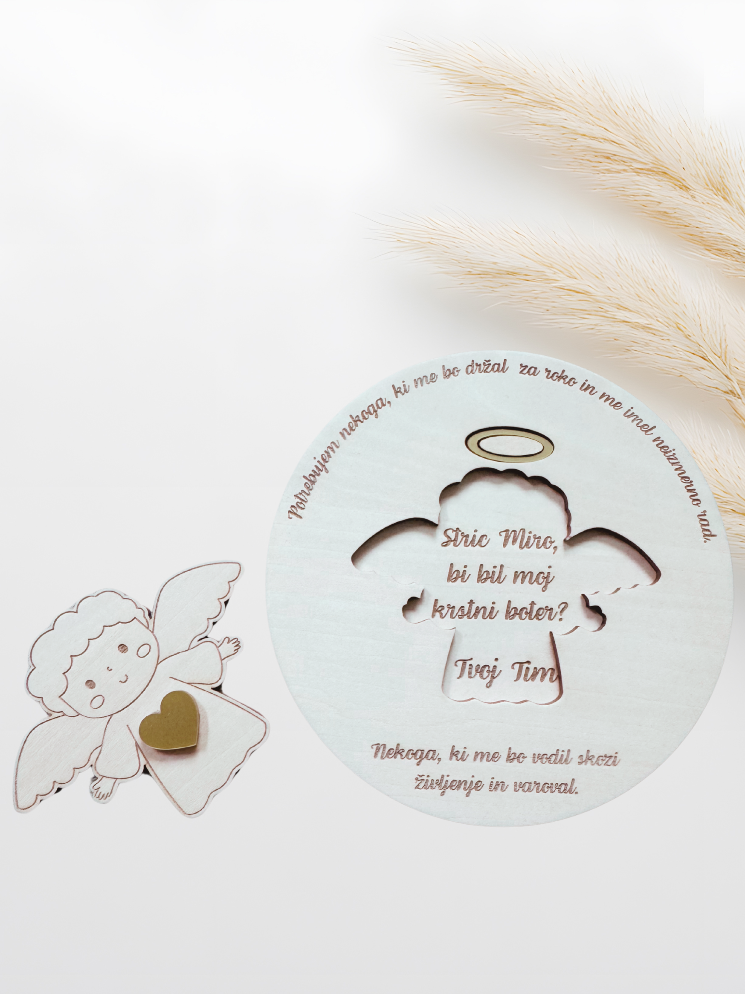 Podarite nepozaben in edinstven spomin ob posebnem trenutku! Naša personalizirana tablica v obliki angelčka je popolno darilo za vašega krstnega botra. Izdelana je iz kvalitetnega lesa, ki ji daje naravni, topel videz, in okrašena z elegantnim zlatim akrilom, ki ji doda pridih prefinjenosti.