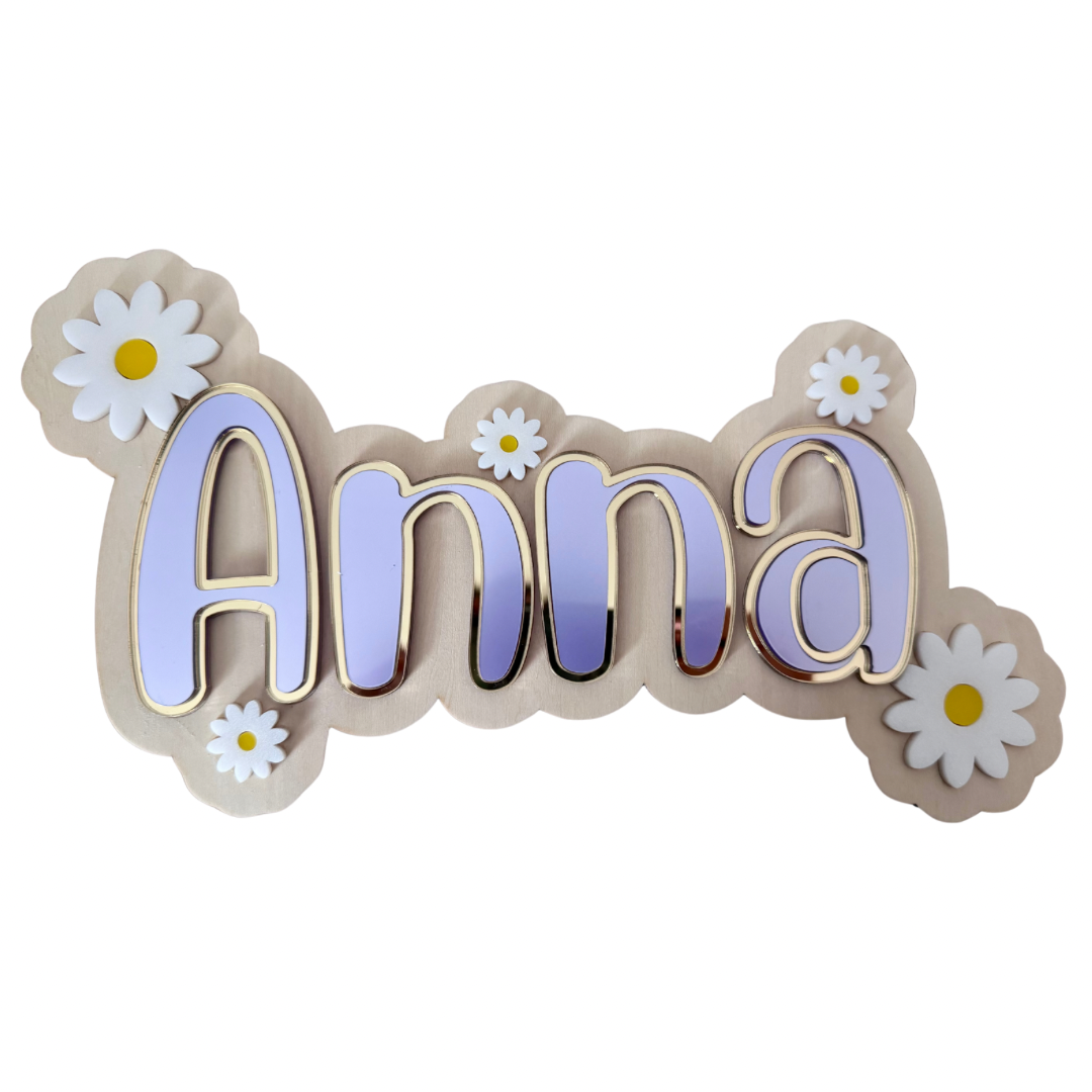 Dodajte čarobnost vsakemu prostoru z unikatno tablico z imenom, izdelano iz kombinacije naravnega lesa in barvitega akrila. Ime je izrezano iz akrilnih črk, ki se nežno dvigajo nad leseno podlago, celoten dizajn pa dopolnjujejo prikupne marjetice, ki prinašajo svežino in igrivost.