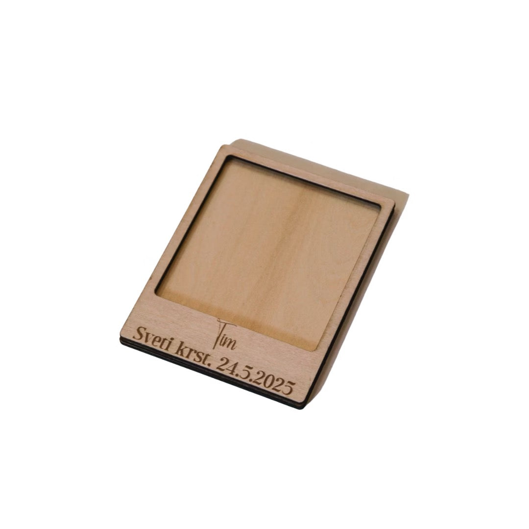 Na okvir je graviran datum svetega krsta, ki ovekoveči ta sveti dan za vedno. Naraven les in dovršeni detajli ustvarjajo topel in iskren spomin, primeren kot darilo botrom, starim staršem ali kot trajna dekoracija doma.