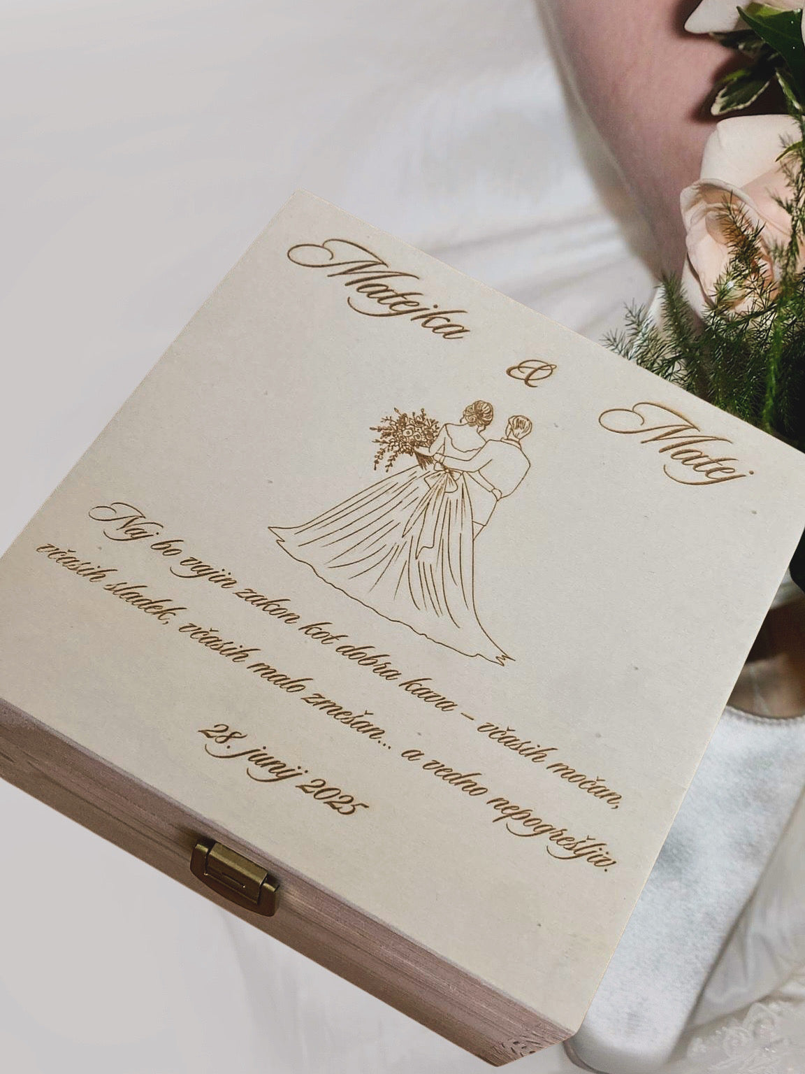 Čudovita lesena škatla, namenjena shranjevanju najlepših spominov na vajin poročni dan. Na pokrovu sta gravirani imeni mladoporočenca, obogaten z izbranim poročni verzom, ki doda pridih ljubezni in večnosti.