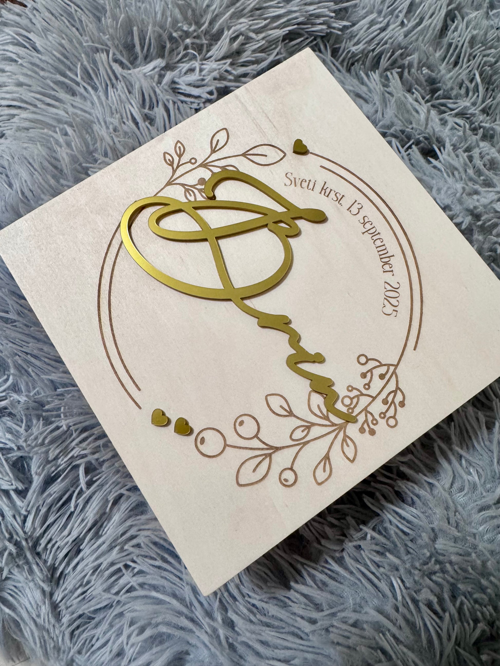 Spominska škatla za sveti krst z graviranim imenom in datumom.