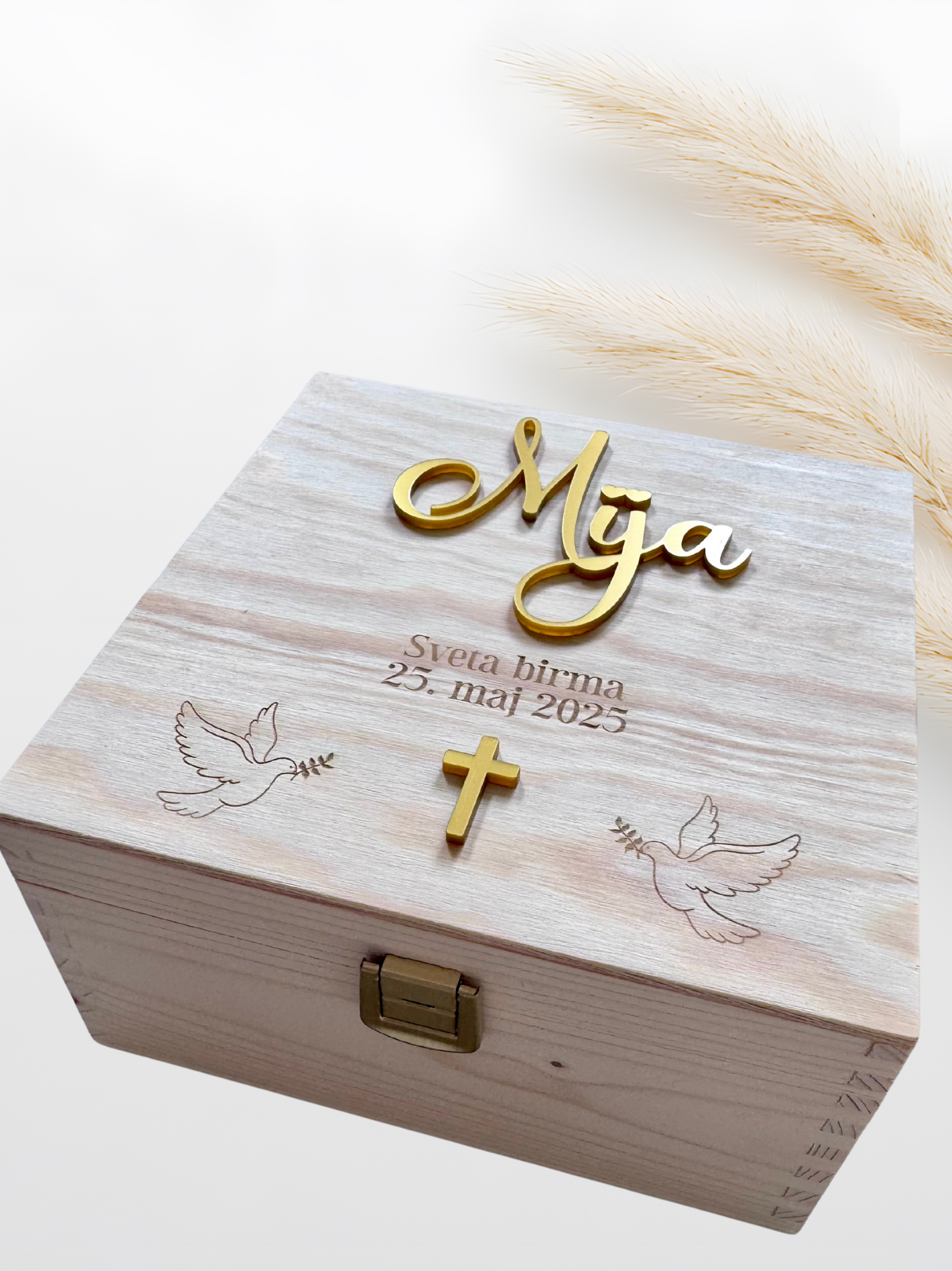 Na pokrovu je natančno graviran datum birme, okrašen z motivom golobov kot simbolov Svetega Duha, ime birman(a/ke) pa je poudarjeno z zlatim akrilnim križem, ki doda škatli poseben sijaj in duhovno globino.