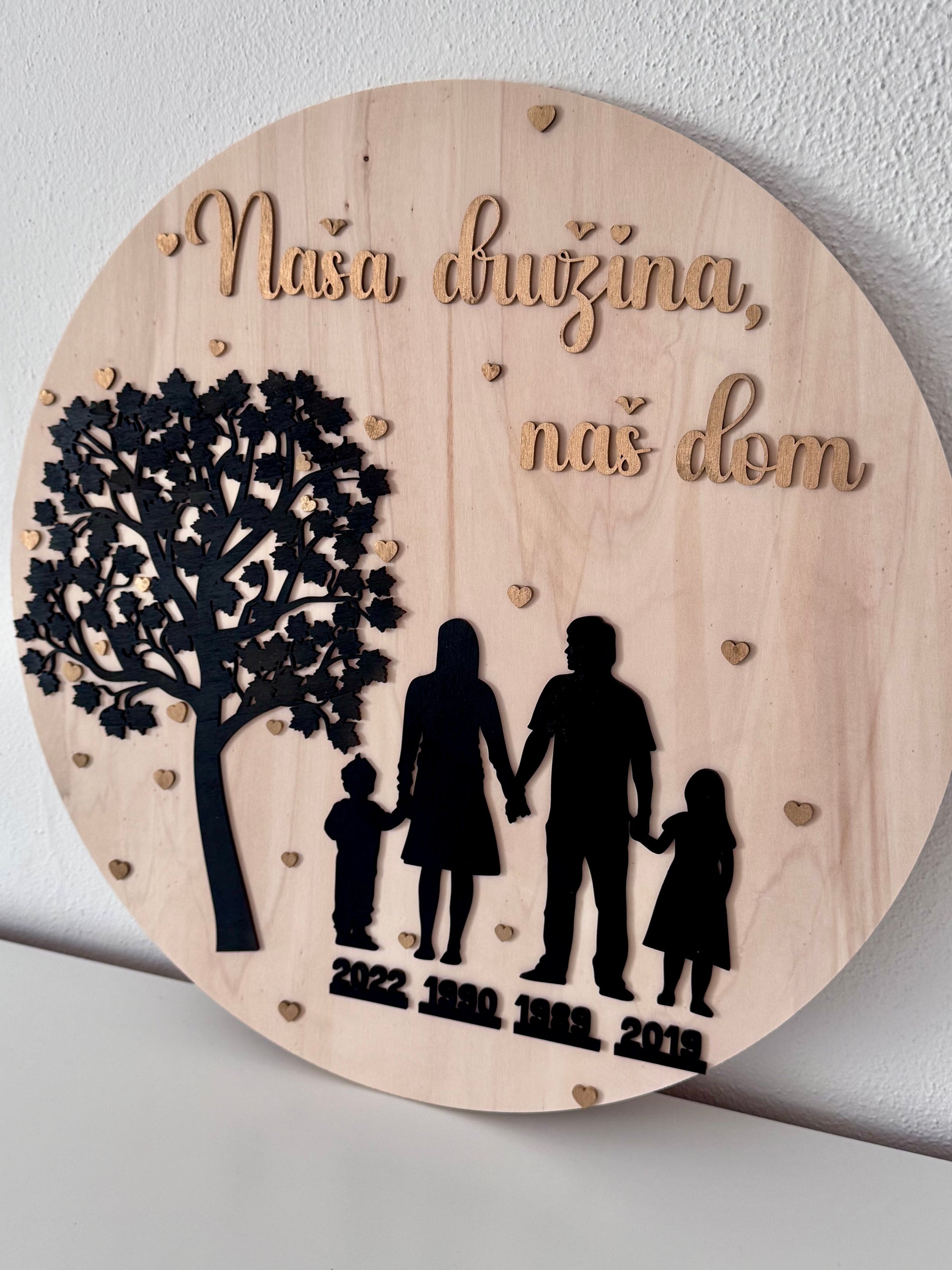 - Motiv: silhueta družine, drevo življenja, personaliziran napis in letnice