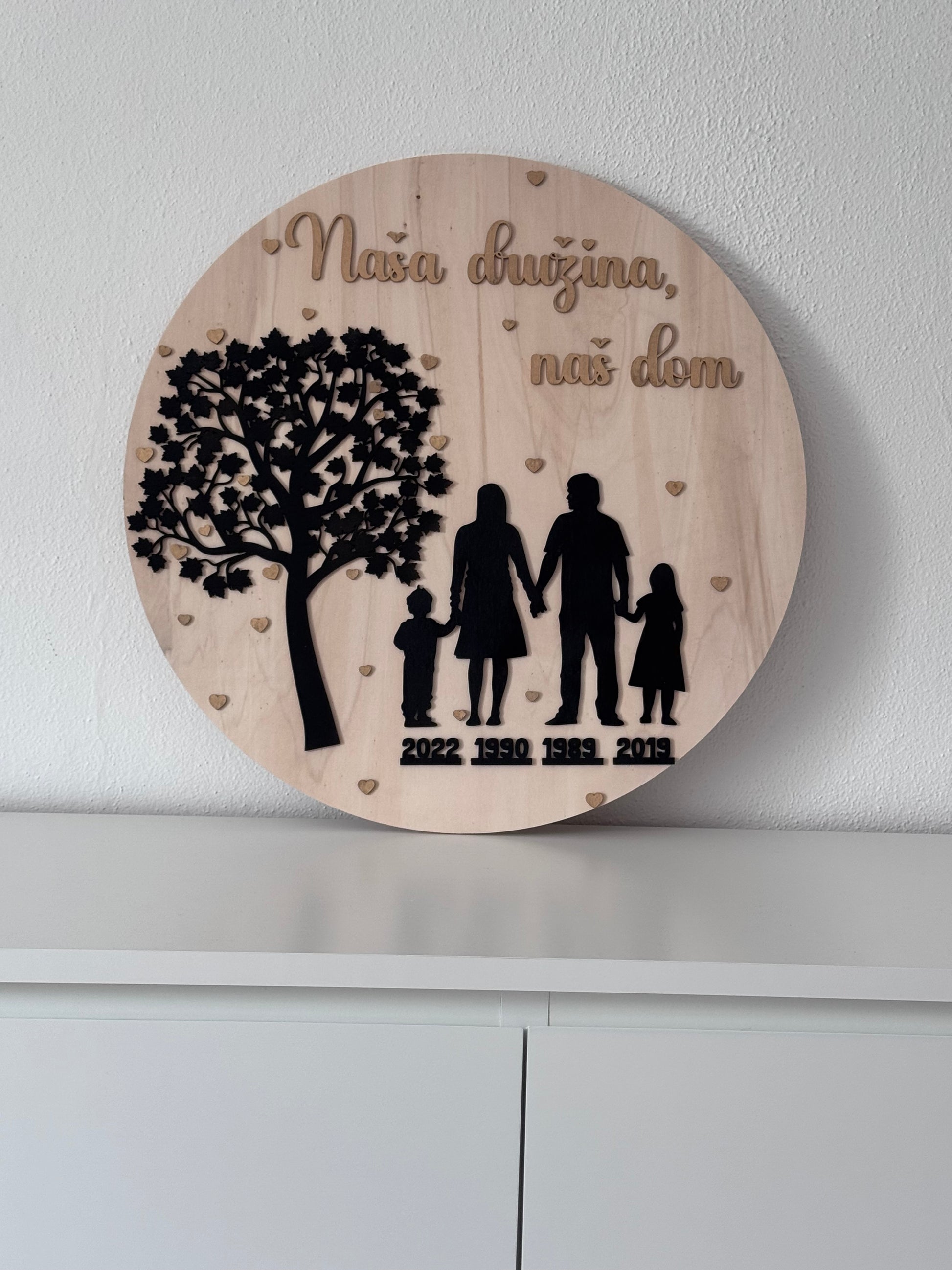 Čudovit okrogel dekor iz lesa, ki ponosno predstavlja toplino doma in povezanost družine. Na lesenem krogu s premerom 60 cm je izrezljana silhueta družine, ob njej pa drevo življenja ter letnice. Napis “Naša družina, naš dom” daje izdelku posebno toplino in pomen, ki bo vsako steno spremenil v zgodbo ljubezni in pripadnosti.